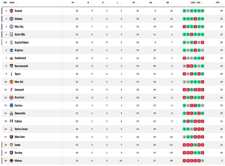 В АПЛ завершился двенадцатый тур и таблица выглядит следующим образом: «Арсенал» победил «Тоттенхэм» и сохранил преимущество над «Челси» и «Манчестер Сити». В еврокубковой зоне продолжают идти «Астон Вилла» и «Кристал Пэлас».