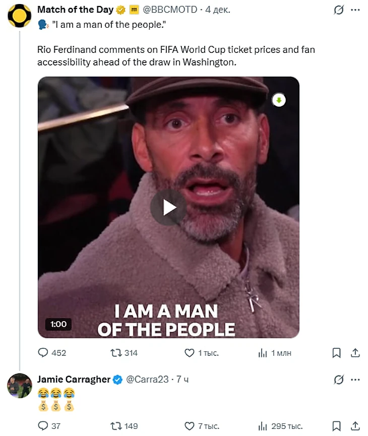 Одним из главных действующих лиц жеребьевки ЧМ-2026 года стал легенда «Манчестер Юнайтед» Рио Фердинанд. Не так давно он переехал жить в Дубай, откуда продолжает свою ютуберскую деятельность. В соцсетях появился ролик с его участием, который взбесил болельщиков и не только их.