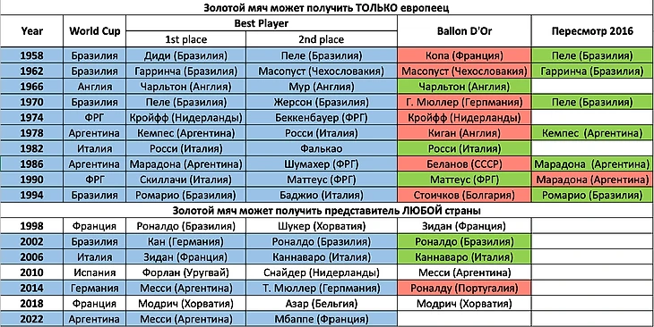 Как итог: множество споров, скандалов и интриг было порождено за почти 70 лет вручения награды. Был даже шестилетний период времени (см. достаточно важное для статистики «Замечание 4»), когда право на вручение награды французский журнал передавал международной федерации футбола FIFA, породившей огромное число скандалов за столь промежуток времени. ЧАСТЬ 1. СВЯЗЬ ЧЕМПИОНАТА МИРА И ЗОЛОТОГО МЯЧА Среди множества нестыковок и негласных критериев вручения Золотого Мяча (далее ЗМ) существует одно, весьма иррациональное правило: величайшей мерой индивидуального превосходства одного футболиста над другим может служить его игра на командном Чемпионате Мира. Да, краткосрочный, проходящий раз в 4 года турнир может оставить более глубокий отпечаток в наследии футболиста, чем множество других турниров. Всё просто: на Чемпионате Мира играют сильнейшие игроки. Раньше можно было добавить «и сильнейшие команды», поскольку сборная страны раньше всегда была сильнее любого клуба. Но сейчас в эпоху глобализации, бесконечных денег и новых правил клубная игра стало настолько сильной и эпохальной, что, уверен, ни одна сборная-чемпион мира с её уровнем подготовки не выиграла бы Лигу Чемпионов того же года. Ну, может быть, лишь Испания-2010, да и то, только из-за того, что 7 из 11 игроков старого состава той команды, представляли один клуб, доминировавший в Европе в те годы (Барселона). Да, ещё один парадокс: Чемпионат Мира больше не определяет сильнейшую команду мира. Едем дальше без остановок.
