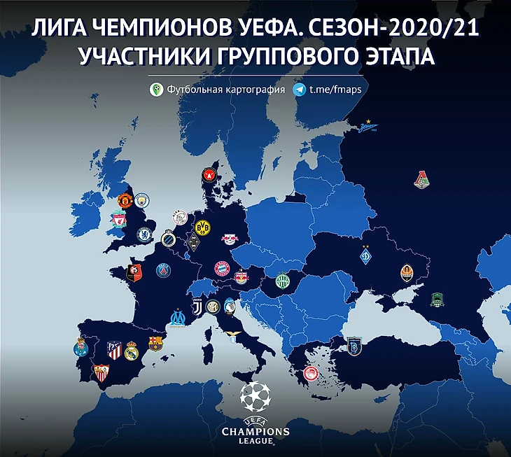 На этой неделе 80 команд взяли старт в групповых этапах европейских клубных футбольных турниров. 32, среди которых впервые в истории сразу 3 российских («Зенит» , «Локомотив» и «Краснодар») начали розыгрыш самого престижного европейского турнира. Ниже — карта всех участников Лиги чемпионов.