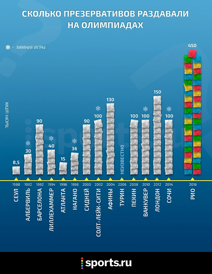 В последние годы важной информацией накануне каждой Олимпиады становится количество презервативов, которые закуплены для спортсменов. Раздавать их в олимпийской деревне начали в 1988 году, на Играх в Сеуле. Рассказывают, что вскоре использованные презервативы начали находить даже на крышах, после чего многие страны попросили своих представителей вести себя поскромнее.