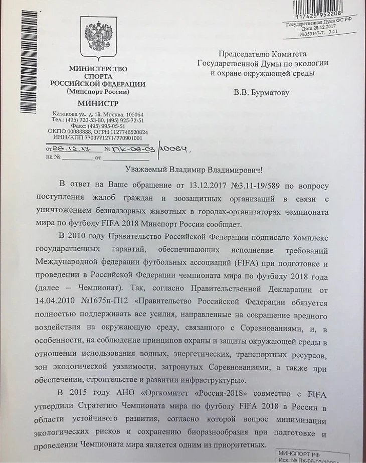 С другой стороны, точно известно, что организаторы ЧМ обеспокоены вопросом о бездомных животных, которые могут покусать иностранных гостей. Председатель комитета Госдумы по экологии и охране окружающей среды Владимир Бурматов (депутат «Единой России») прислал Sports.ru документ за подписью министра спорта России Павла Колобкова (главное – на второй странице):