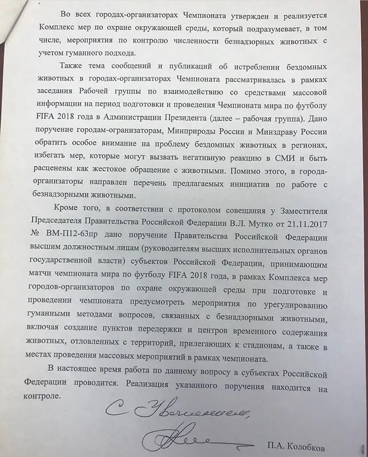 «Тема сообщений и публикаций об истреблении бездомных животных в городах-организаторах Чемпионата рассматривалась в рамках заседания рабочей группы по взаимодействию со СМИ на период подготовки и проведения ЧМ по футболу в Администрации Президента. Дано поручение городам-организаторам, Минприроды России и Минздраву России обратить особое внимание на проблему бездомных животных в регионах, избегать мер, которые могут вызвать негативную реакцию в СМИ и быть расценены как жестокое обращение с животными. В города-организаторы направлен перечень предлагаемых инициатив по работе с безнадзорными животными», – написано в документе.