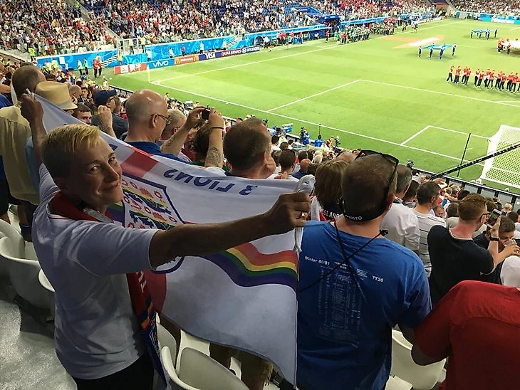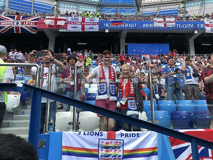 Мы показываем нашу причастность к ЛГБТ-сообществу только на стадионах, не на улицах городах. ФИФА, федерация футбола России и Алексей Смертин сказали: «На стадионах будет безопасно». Поэтому мы ограничились территорией арен. Но и в Волгограде, и в Нижнем Новгороде у нас были баннеры и шарфы «Трех львов» с радугой. На обоих матчах общение с болельщиками было фантастическим – как с англичанами, так и с русскими. Люди подходили, делали селфи с баннером, пожимали нам руки. Они прекрасно понимали, что значит этот баннер. Все это стало для нас настоящим откровением.
