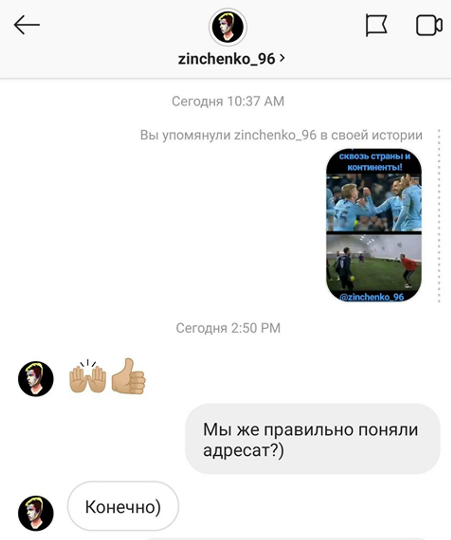 Зинченко подписался на нас 20 июля. Он знает про «Зинченко недели» (видеорубрика на канале Нечая – Sports.ru), он как раз подписался на нас после этих видосов. Пару раз в директе переписывались, договаривались летом пересечься в Москве, пока не получилось.