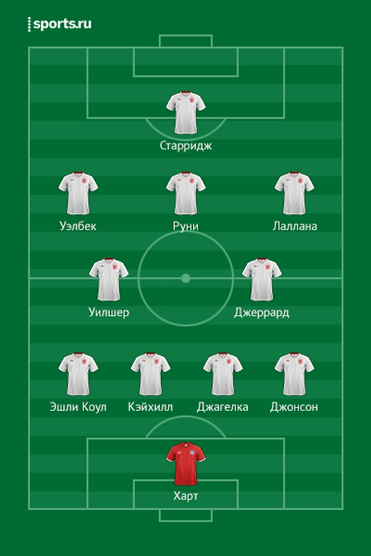 Харт, Фостер, Форстер — Джагелка, Кэйхилл, Смоллинг, Ф.Джонс, Гл.Джонсон, Эшли Коул, Бэйнс — Джеррард, Лэмпард, Уилшер, Кэррик, Хендерсон, Баркли, Милнер, Таунсенд, Лаллана — Руни, Уэлбек, Старридж, Ламберт.