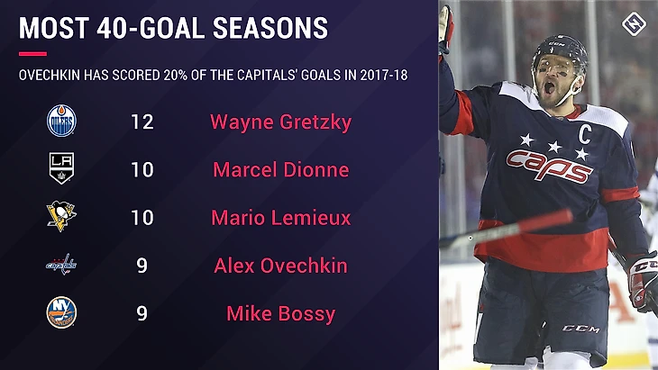 Что касается юбилейной шайбы, он сказал: «40 – это хорошо, но 50 – намного лучше». «Кэпиталз» осталось провести 17 матчей, и, если ему покорится отметка в 50 голов, этого он добьется 4-й раз за последние 5 лет и 8-й раз за время своей карьеры. Он будет лишь на один сезон отставать от лидеров за всю историю лиги Уэйна Гретцки и Майка Босси. Уже 6 лет никто кроме Овечкина не может добраться до 50 голов.