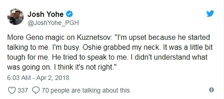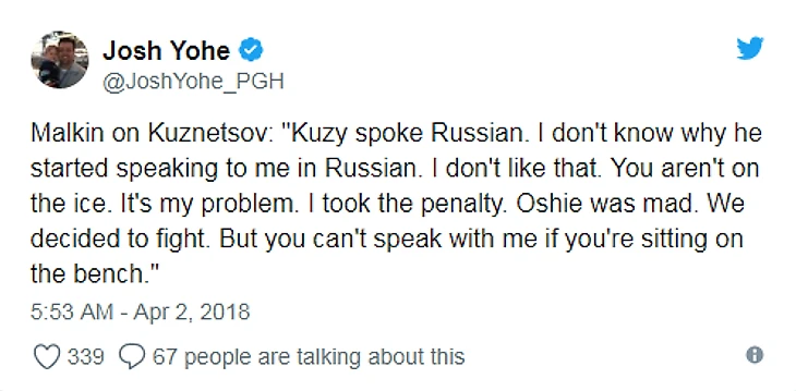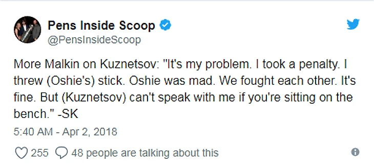 Малкин по поводу Кузнецова: «Кузя заговорил на русском. Не знаю, почему он начал говорить мне по-русски. Мне это не нравится. Ты не на льду. Это моя проблема. Я заработал удаление. Оши злился. Мы решили драться. Но ты не можешь говорить со мной, когда находишься на скамейке.