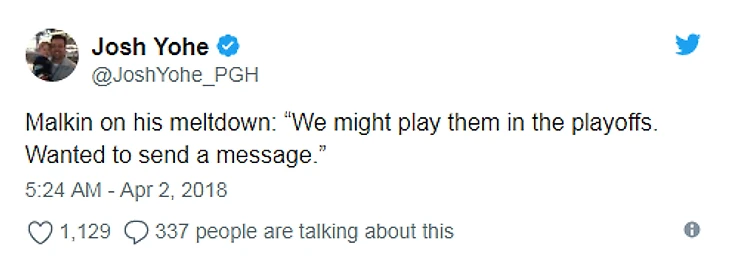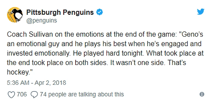 Малкин отказывался покидать лед, крича на Кузнецова. Форвард «Пингвинз» заработал 14 минут, включая 2 минуты за блокировку, 2 минуты за грубость и 10 минут дисциплинарного штрафа.