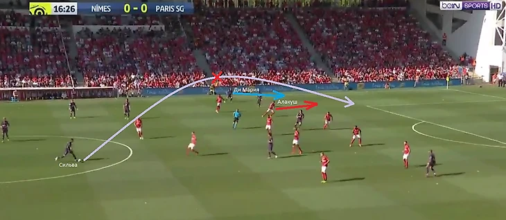 Тьяго Сильва в хорошей позиции для длинной передачи в свободную зону. Ди Мария видит это, поднимает руку прося передачу, и начинает рывок по флангу. Но Алакуш реагирует на это и начинает свой рывок в эту зону, практически, одновременно с аргентинцем. В свою очередь Сильве, уже было начавшему делать заброс на Анхеля, приходится резко менять решение и делать неподготовленную передачу на другой фланг которая окажется неточной и мяч будет потерян.