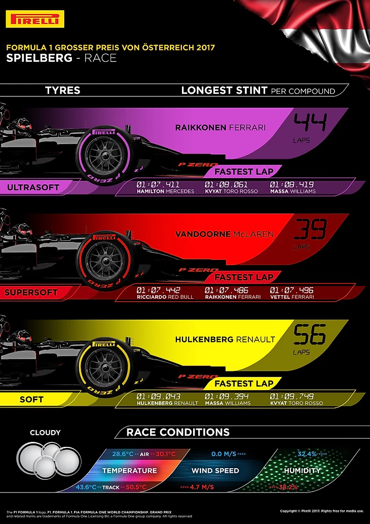 Однако Австрию британец покидает не с пустыми руками: на его счету быстрейший круг гонки, который также стал рекордом трассы, превзойдя время Михаэля Шумахера, показанное в 2003 году. Это первый в карьере рекорд трассы для Хэмилтона. 11 разных пилотов удерживают за собой рекорды всех трасс этого чемпионата. Лучший по этому показателю Феттель – 4 трассы, по 3 у Кими Райкконена и Михаэля Шумахера.