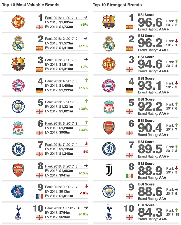 Наибольший рост за год показали набравший рекордные 100 очков в Английской Премьер Лиге Ман Сити и пробившийся в финал Лиги Чемпионов Ливерпуль. В случае мерсисайдцев, важную роль играют не только спортивные достижения, но также отличная работа менеджмента (новые спонсорские контракты, работа в соцсетях) и рост стоимости состава.