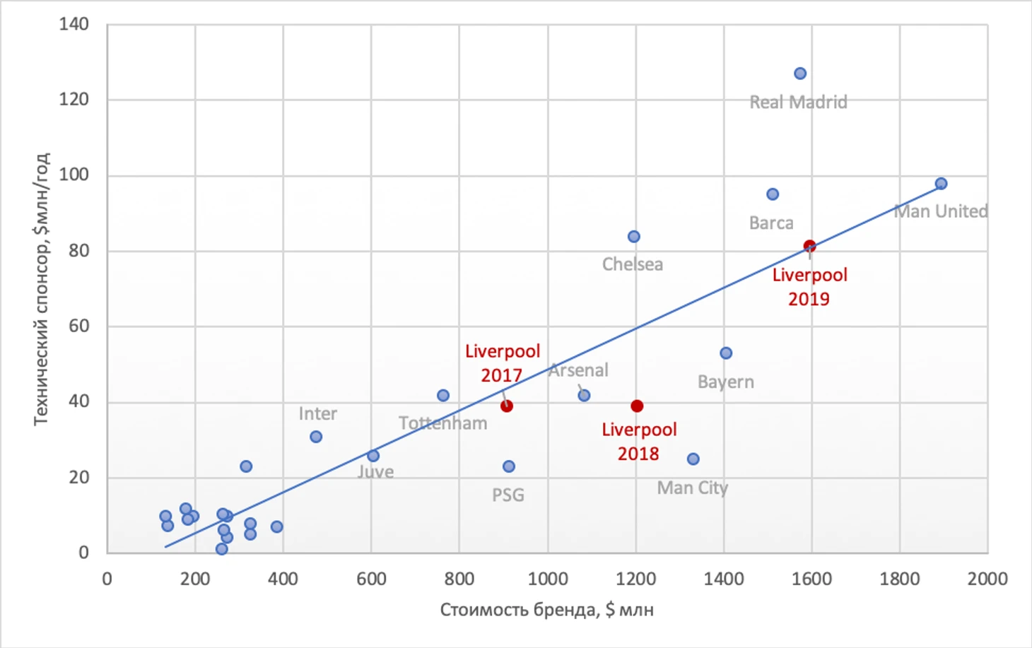 Особенно интересна ситуация в Англии – затяжной спад купающегося в спонсорских деньгах МЮ и недавние контракты Челси и Тоттенхэма, идущие вразрез со стоимостью их брендов, выступают аргументом в переговорах для клубов-конкурентов. Арсенал уже договорился с Adidas о 5-летнем контракте, по которому ежегодно будет получать 60 млн фунтов (около 75 млн долларов), на схожие деньги. На этом интересно оценить стремление Ливерпуля получать схожие с МЮ и Челси деньги по новому договору, и переговорная позиция мерсисайдцев выглядит весьма прочной. Дополнительным аргументом является рост стоимости бренда Ливерпуля за счет успехов на поле и блестящей работы менеджмента клуба. График ниже наглядно показывает, что, если еще год назад контракт с New Balance выглядел экономически оправданным, сейчас ситуация изменилась за счет роста стоимости бренда почти на треть. В 2019-й год Ливерпуль входит претендентом на самые престижные трофеи, и стоит ожидать дальнейшего улучшения бизнес-показателей. Опираясь на построенный нами простой линейный тренд, можно оценить «справедливую» стоимость в переговорах с новым спонсором в 75-80 миллионов долларов ежегодно. Эта сумма выглядит вполне обоснованной при стоимости бренда клуба в 1400-1600 миллионов долларов. Если мерсисайдцам удастся дотянуть до 100-миллионного контракта соседей из Манчестера, это можно будет считать безусловным успехом переговорщиков клуба.