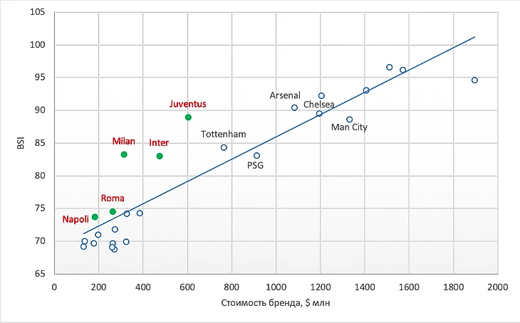 Ситуацию хорошо отображает соотношение силы брендов клубов (их BSI) и стоимости этих брендов. Как следует из методологии расчетов, низкая стоимость бренда при высоком BSI демонстрирует неспособность клуба по тем или иным причинам конвертировать сильную базу (болельщики, традиции, состав) в коммерческие результаты. Именно в такой ситуации находятся итальянские гранды: небольшой телеконтракт лиги, неспособность ее руководства создавать шоу и устаревшие стадионы ограничивают потенциал роста выручки. По силе бренда миланские клубы стоят на одном уровне с ПСЖ и Тоттенхэмом, а Ювентус – с Арсеналом, Челси и Ман Сити. При этом, отставание в стоимости бренда, отражающей коммерческий потенциал, крайне значительно.