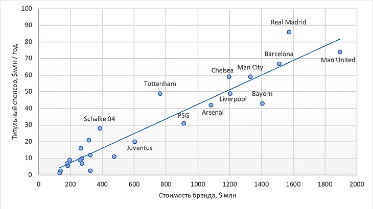 Ниже я вывел на график соотношение стоимости бренда и суммы контракта с титульным спонсором в миллионах долларов. Сразу отмечу, что по ряду контрактов данные разнятся, кроме того, возможна погрешность из-за курса конвертации в доллары.