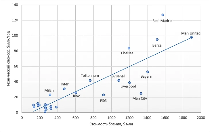 В случае с техническими партнерствами, на мой взгляд, гораздо уместнее уже не линейный, а скорее параболический тренд. Лидеры в последние годы сумели выбить себе немыслимые по меркам остальных контракты, суммы которых переходят отметку в 100 миллионов в год.