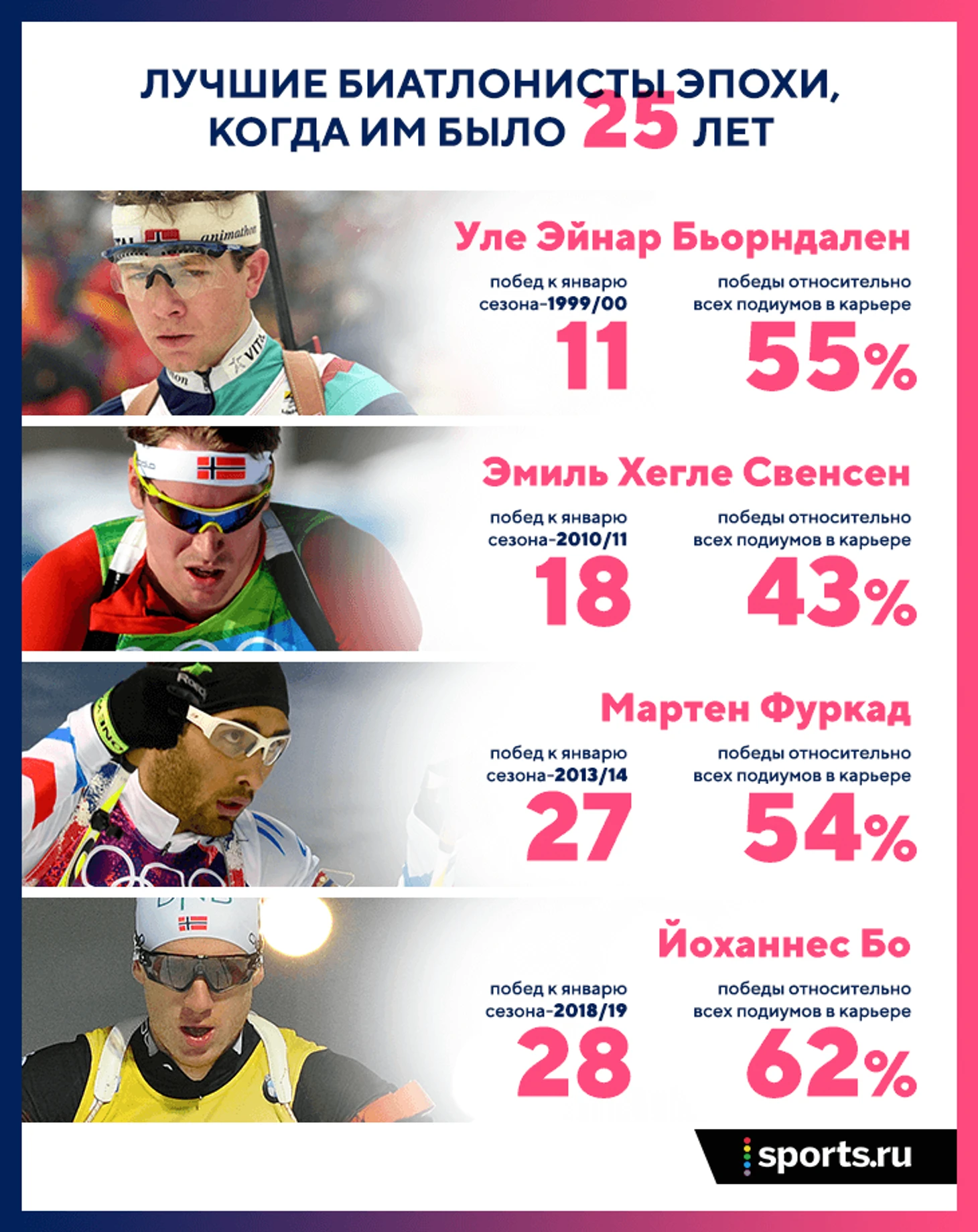 Но пока Бо единолично лидирует и штампует победы одну за другой. Он уже приблизился к рекордным показателям Фуркада, и если продолжит в том же духе, то рекорду Бьорндалена по победам будет угрожать не только француз.
