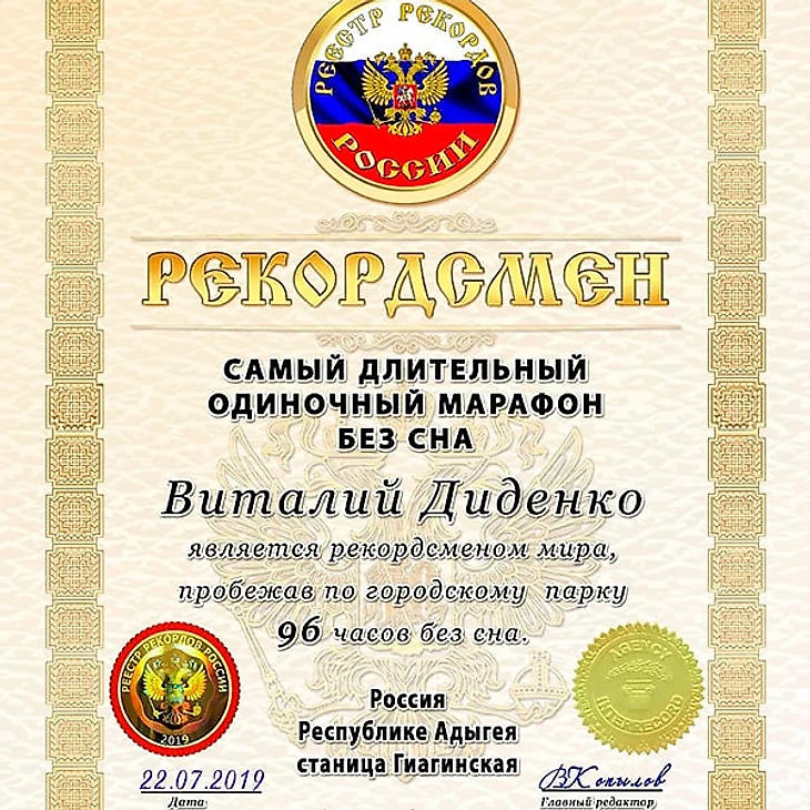 Четверо суток Диденко бегал почти без остановок по парку в станице Гиагинской (республика Адыгея). 23-летний спортсмен раньше участвовал в ультрамарафоне на 480 км и экстрим-гонке Ironman (плавание на 4 км, велозаезд на 180 км и марафон), а теперь установил рекорд мира по длительности забега.