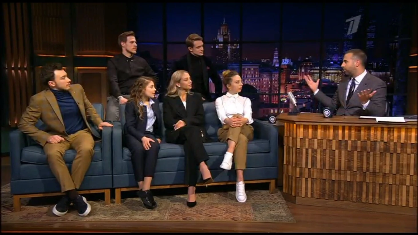 Ургант: На чемпионате Европы по фигурному катанию сборная России завоевала 10 медалей из 12 – собрали все золото. Сегодня лучшие фигуристы у нас в гостях. Встречайте: Алена Косторная, Дмитрий Алиев, Виктория Синицина, Никита Кацалапов, Александра Бойкова и Дмитрий Козловский.