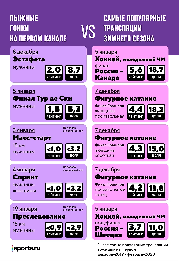 Ни мужской масс-старт, ни финалы спринтов на «Туре» не вышли в лидеры телерейтингов. Зато гонка в гору 5 января заняла 4-е место в рейтинге спортивных трансляций недели, выше – только решающие игры нашей хоккейной молодежки на чемпионате мира. Но и конкурентов было немного – ни биатлона, ни фигурного катания.