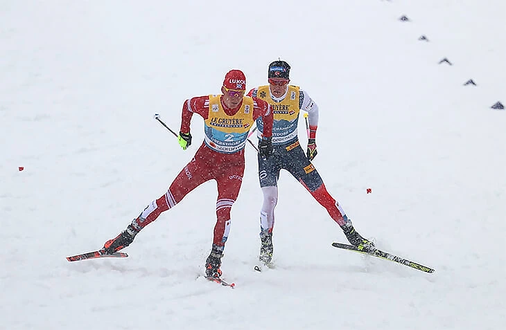 Если на нынешнем чемпионате мира Глеб Ретивых финишировал в команднике и не удержал преимущество, созданное Большуновым, то два года назад закрывал гонку Александр. Но и он не справился под натиском Клэбо.
