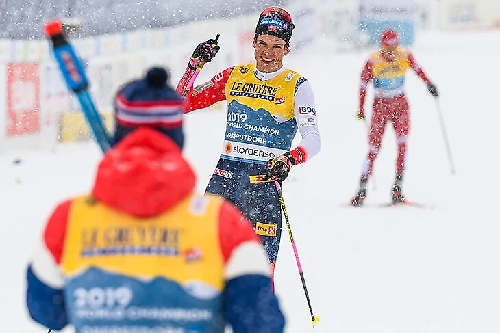 На чемпионате мира в Оберстдорфе встречи ждали долго, но не складывалось: то Большунов не дотягивал в спринте, то Клэбо рано отваливался в скиатлоне.