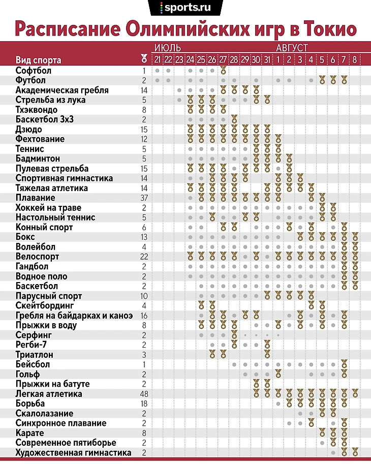 В Токио разыграют 339 комплектов наград в 33 видах. Для сравнения: в Рио-2016 видов было 28, а комплектов 306, в Лондоне-2012 – 26 и 302 соответственно. Даже на следующей Олимпиаде в Париже разыграют меньше медалей (329).