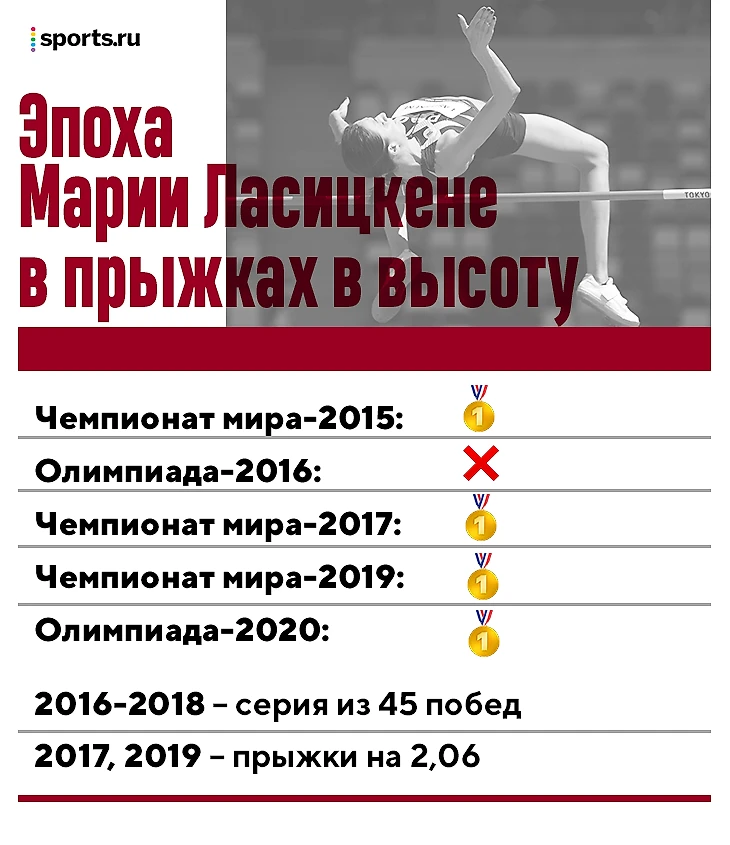 Ласицкене – уникальная спортсменка. Она единственная в истории трехкратная чемпионка мира в женских прыжках в высоту. С 2016 по 2018-й выдала суперсерию из 45 побед подряд. Она обладательница четвертого результата в истории (2,06 – всего 3 см до рекорда мира).