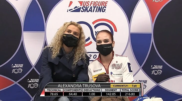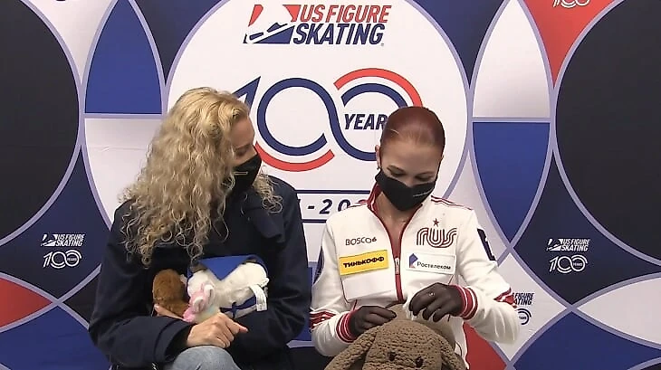 После проката Трусова расстроилась, но напряжение сняли болельщики – Саша уже выходила со льда, когда Этери (она в Америке непременно в маске, в отличие от внутренних турниров) напомнила, что нужно забрать подарки от фанатов. Фигуристка со смехом развернулась и поприветствовала трибуны под выкрики на русском «Саша, ты лучшая».