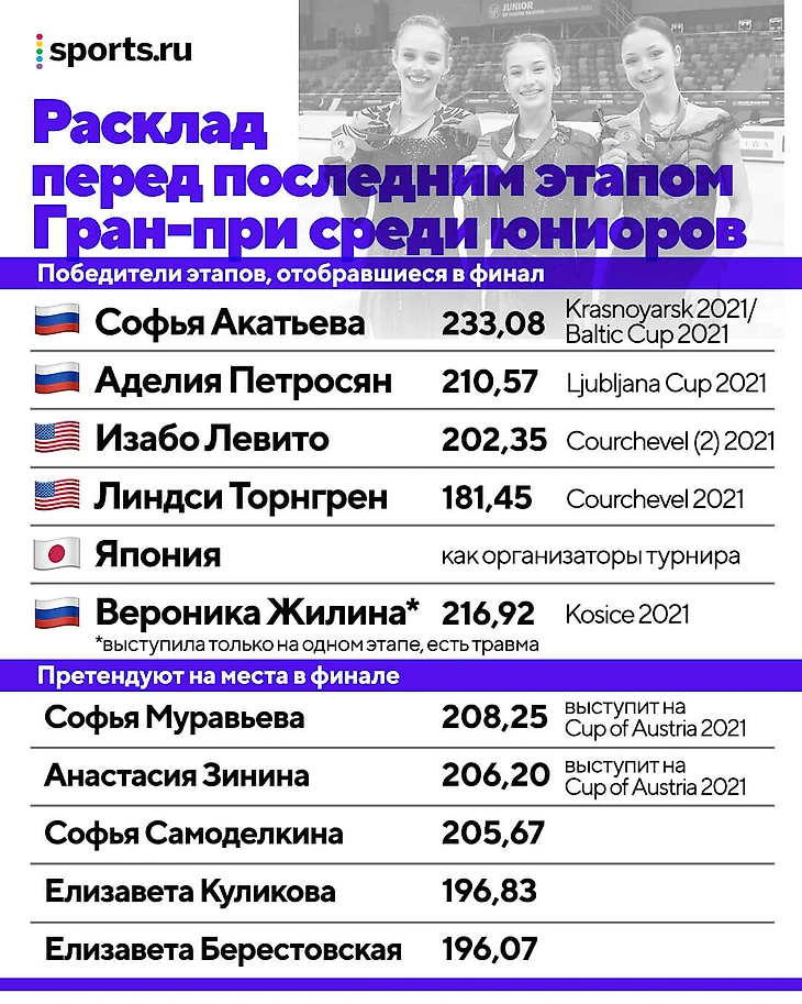 Если все-таки Жилина проходит по новым критериям, то уже сейчас известны 5 финалисток из 6. За последнее место поборются Софья Муравьева и Анастасия Зинина. Победительница заключительного этапа (если ей не будет Изабо Левито) автоматически проходит в финал. Если выиграет американка, то Муравьева и Зинина разыграют последнюю квоту по сумме баллов (сейчас по этому показателю выше Муравьева).