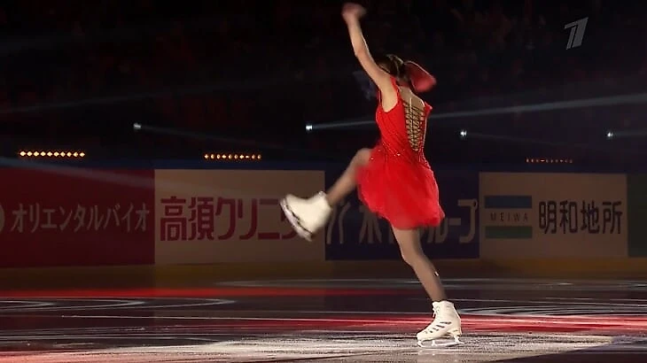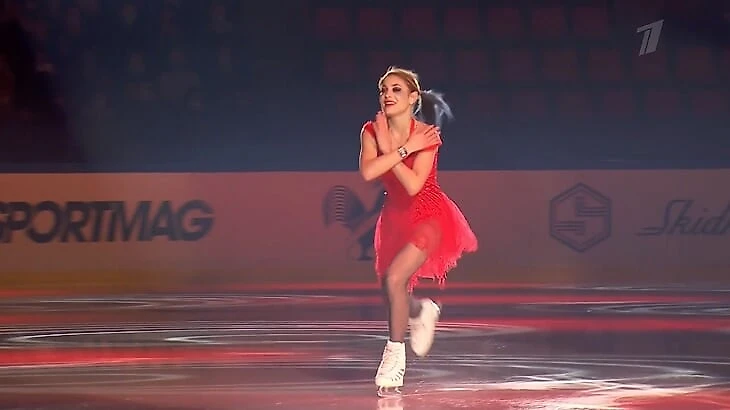 Косторная вышла на лед (точнее спрыгнула с борта) в колготках в сеточку и огненно-красном платье с многослойной равной юбкой и шнуровкой на спине.
