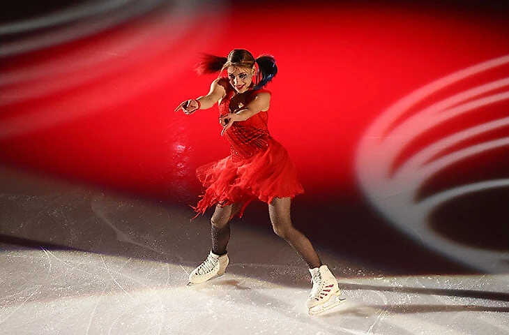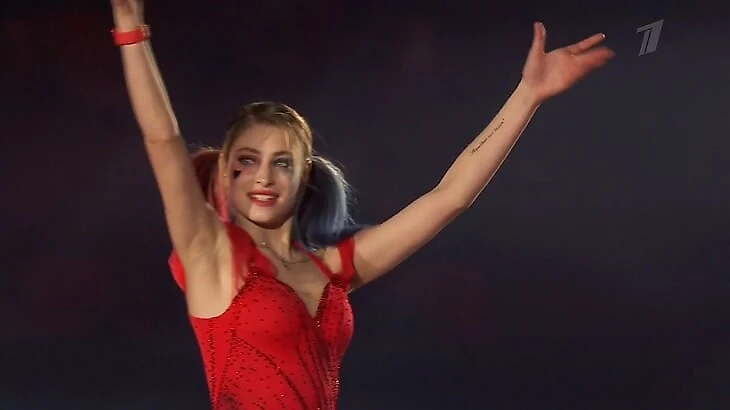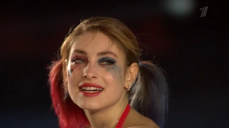 Узнать по прическе несложно, за несколько минут до Алены в похожем образе выходила Леа Серна. Вот только француженка выбрала очень распространенный костюм Харли – с разноцветными шортами и яркой курткой. Недавно в таком зажигала Евгения Медведева на «Ледниковом периоде».