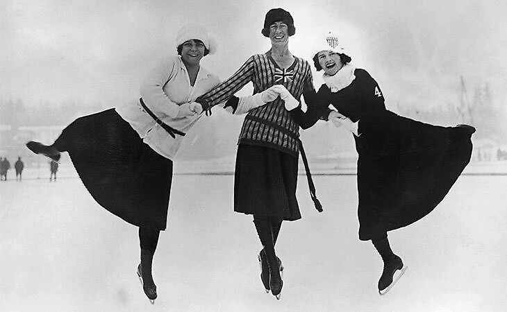 В 1920-е на аренах одевались иначе – толстые колготки и перчатки, меховые воротники и объемные свитера, длинные юбки тоже никуда не делись. Во многом причина такого многослойного и далекого от удобства стиля – морозы, ведь соревнования проходили на открытых площадках.