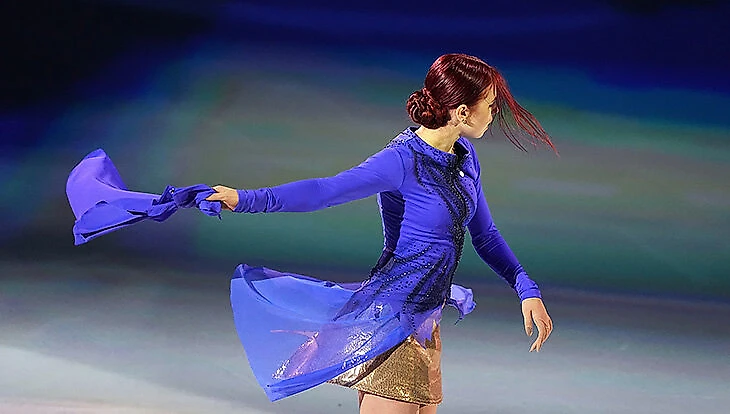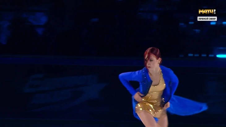 Трусова пообещала продолжить полет, а в середине номера сменила синее платье на золотое