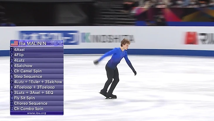3. Начался исторический прокат с четверного акселя. Илья уверенно зашел на прыжок, чуть «клюнул» при приземлении, но получил плюсы по шкале GOE. Хотя тут мнения судей разделились: один из них поставил +3, другой -1, но большинство – нейтральный 0.