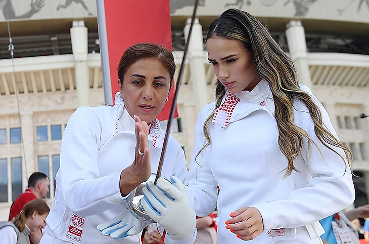 Загитова второй год удивляет на фестивале: в прошлый раз попробовала бокс, в этом году – фехтование. Сначала прошла инструктаж от двукратной олимпийской чемпионки по командной шпаге Карины Азнавурян, а потом вышла на поединок.