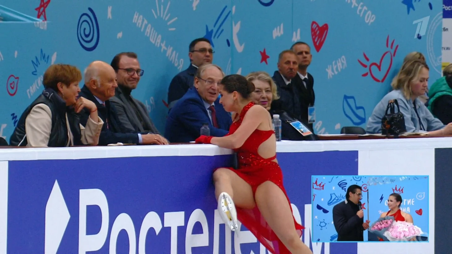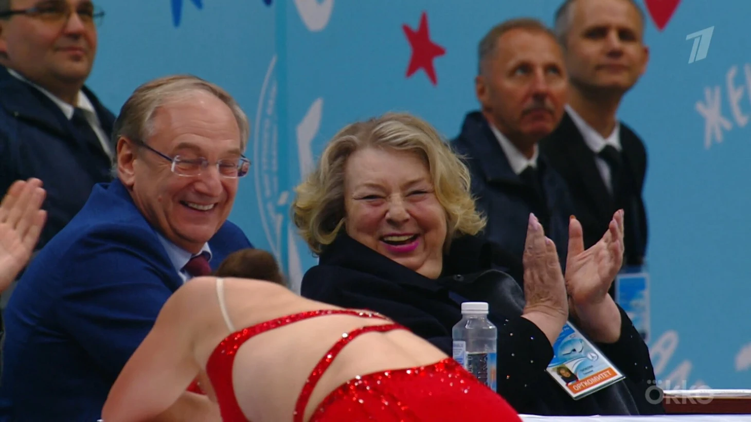 Она начинает программу рядом с бортиком – обычно там сидят судьи, но на контрольных прокатах расположились Антон Сихарулидзе, Татьяна Тарасова, Александр Коган и другие руководители федерации/эксперты.