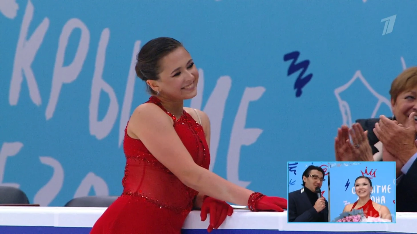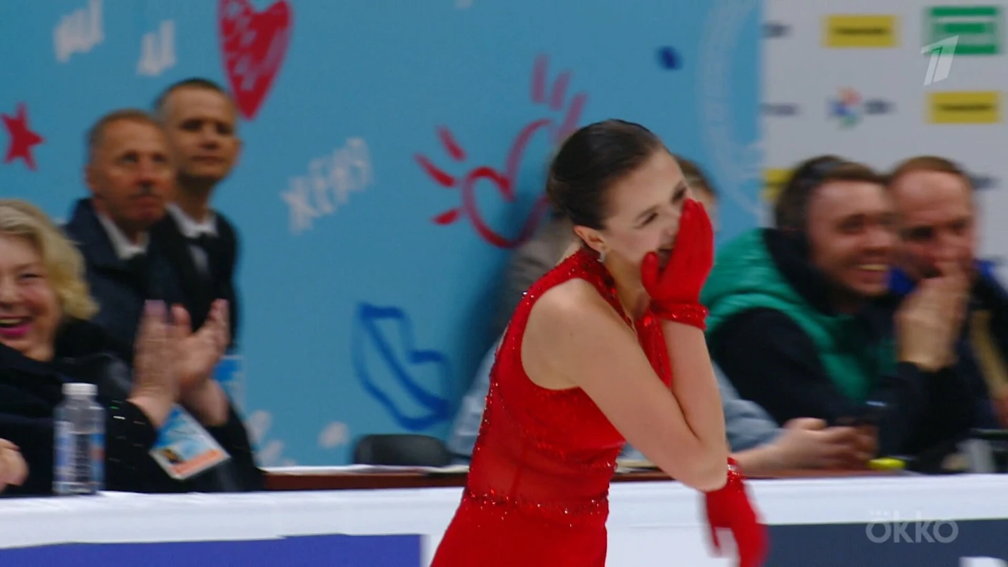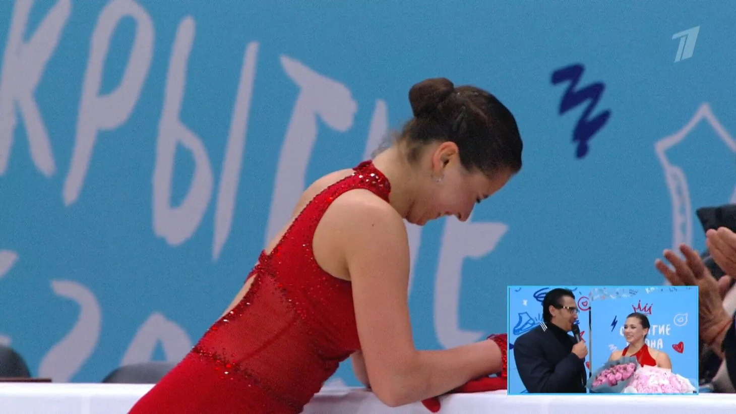 У проката кольцевая композиция, так что по задумке в финале Камила снова возвращается к борту. Но вместо кокетливого движения она потеряла равновесие, и борт оказался уже необходим – Валиева почти упала на него.