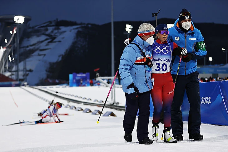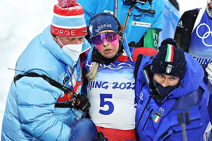 Норвежскую биатлонистку накрыло на Олимпиаде: добегала гонку на автомате, а с финиша ее уносили на руках