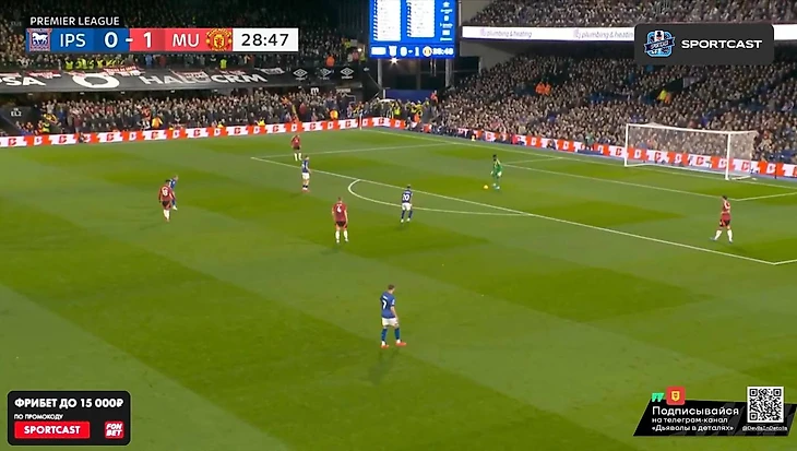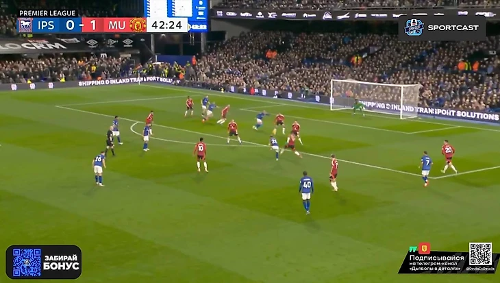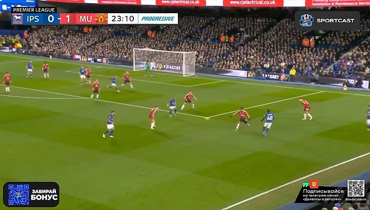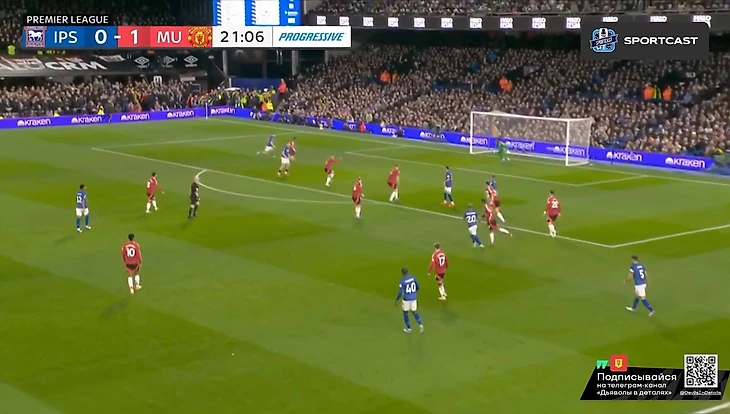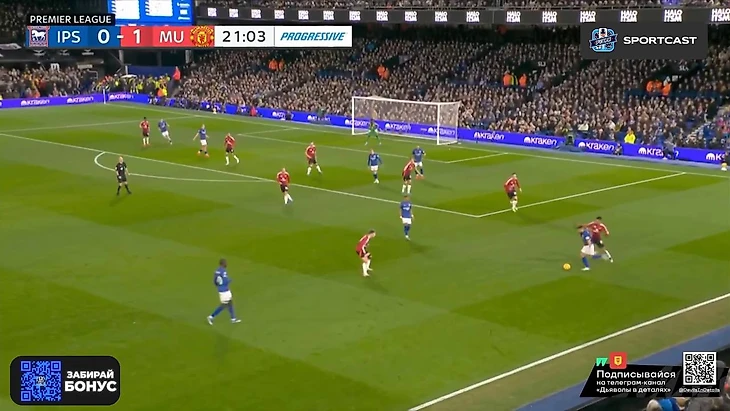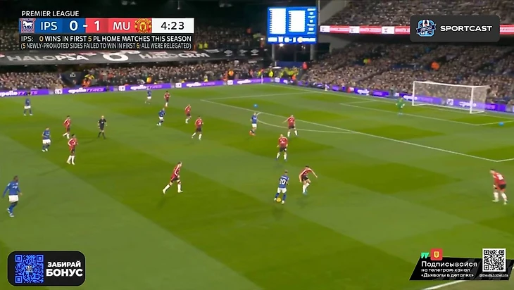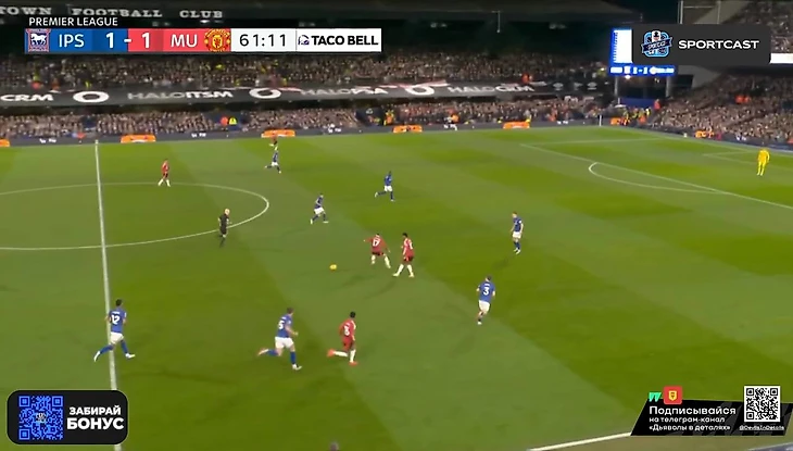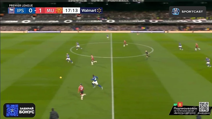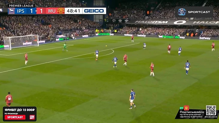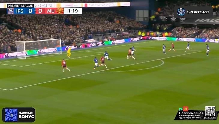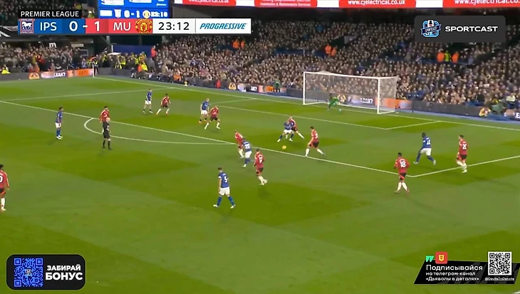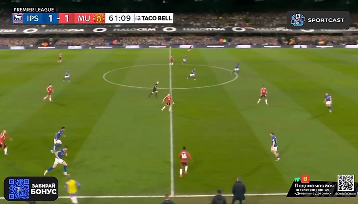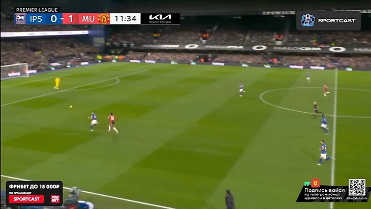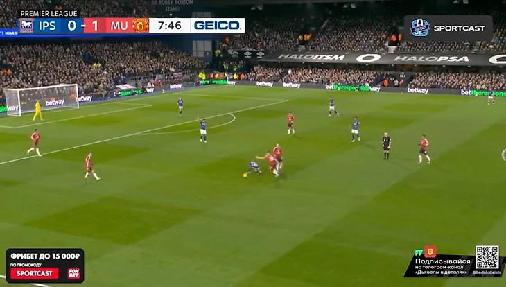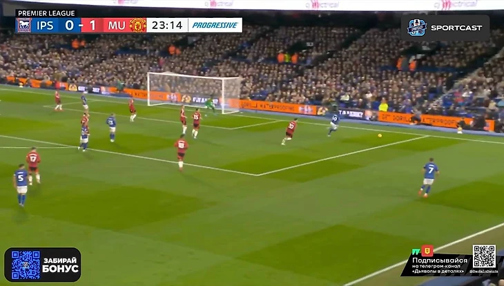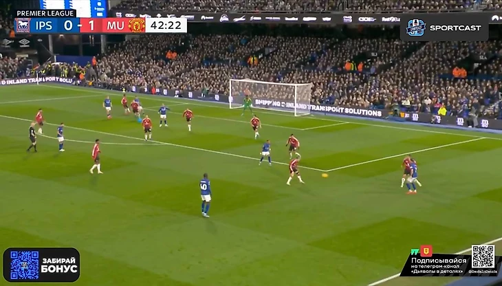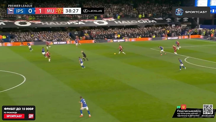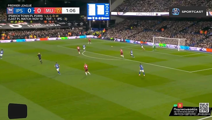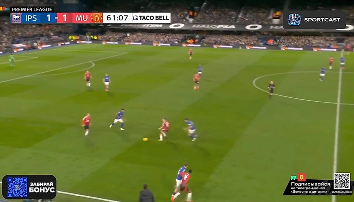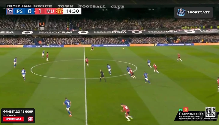После перепаса в своей трети соперник пытается прессинговать: так как действие происходит на правом фланге «Ипсвича», их оборона немного заваливается вправо и по мере продвижения мяча начинает немного «поддушивать» своих оппонентов. В игровой модели Аморима латераль должен поймать тайминг для простой, но эффективной передачи, а нападающий/10-ка – для рывка.