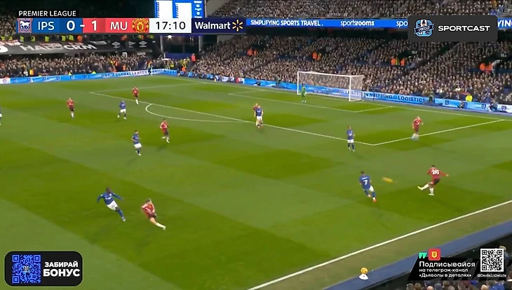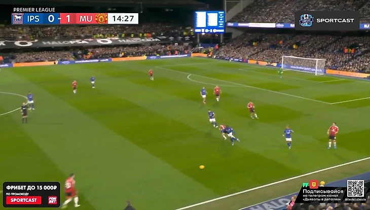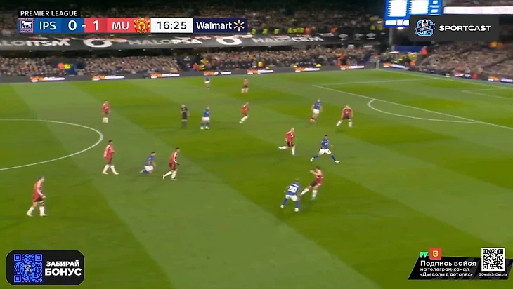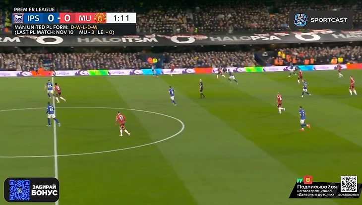 На эту деталь обращает внимание в том числе Антон Михашенок: Аморим любит использовать в слоте левого латераля – правшу, а в слоте правого – левшу. Это ключевой игрок в преодолении прессинга одной передачей. Рассмотрим на примере Далота, который играл с Ипсвичем слева.