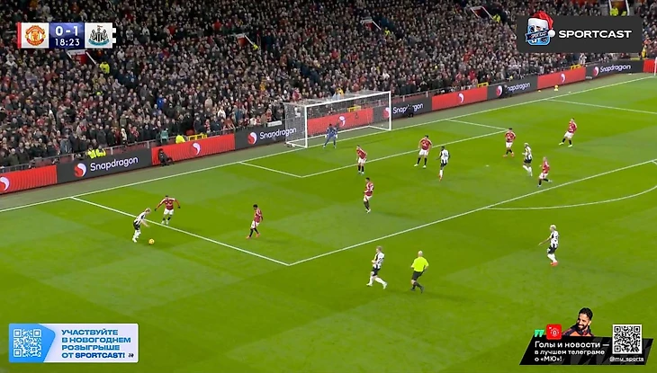 «Ньюкасл» весьма беспрепятственно проходил центр за счет численного преимущества – два возрастных футболиста «МЮ» оказывались в меньшинстве против Тонали, Гимараеша и Жоэлинтона, иногда за мячом опускался Исак, за которым не шли внешние центральные защитники. Этот паттерн фигурировал и в ситуации с первым пропущенным, и далее до выхода Майну.