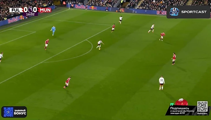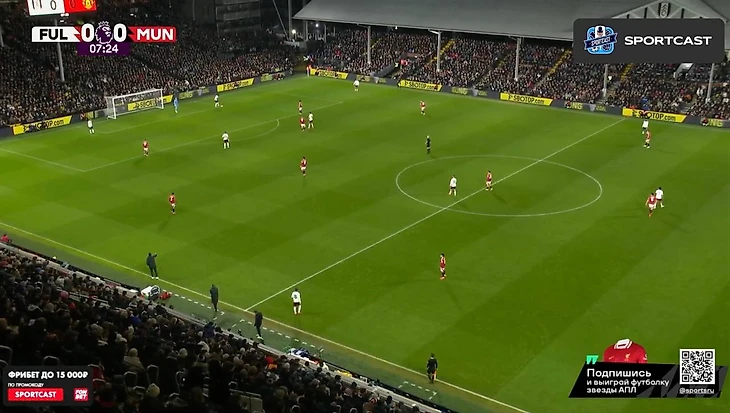 В атаке тоже наблюдался кризис идей – хозяева сдерживали «Юнайтед» благодаря дисциплинированности линии обороны и опорной зоны. Практически всегда при позиционных атаках гостей и их переходных фазах хозяева опускали линию обороны на комфортную глубину – из-за чего и Расмус часто опускался за мячом, а не утомлял защитников рывками за спину, и Амад с Гарначо не имели достаточно пространства.