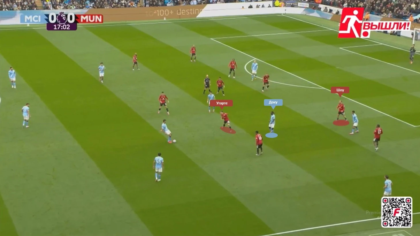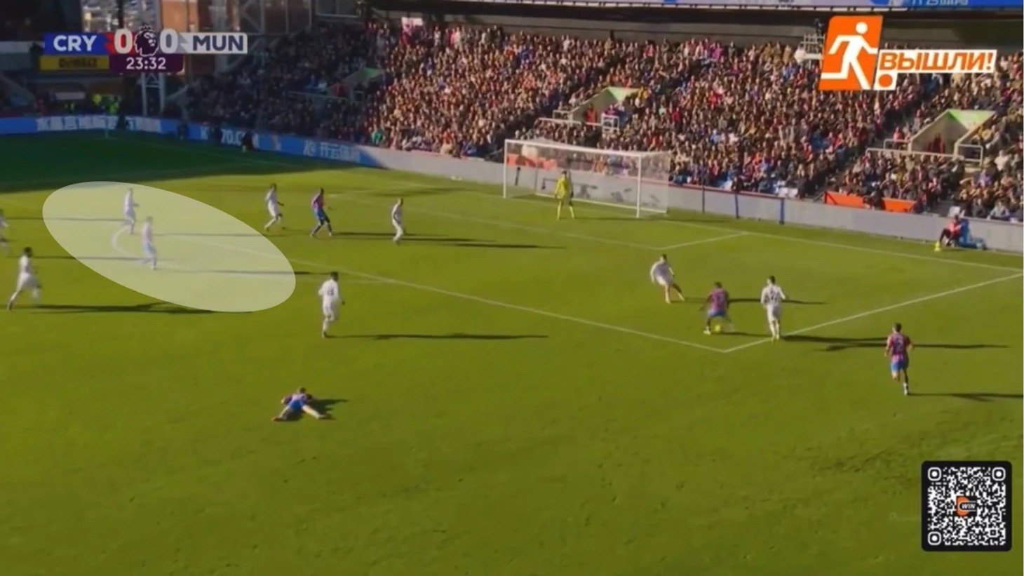 С этой проблемой команда сталкивается с незавидной регулярностью. Учитывая, что подобные моменты встречаются, как правило, в быстрых атаках или после успешного прохождения соперником высокого прессинга манкунианцев, причину стоит искать в том, что (1) игроки опорной зоны не успевают выполнять большой объем перемещений и (2) их качественные характеристики к этому не располагают: Бруну имеет явный атакующий уклон (вспоминаем пропущенный мяч от «Фулхэма», Каземиро уже не может покрывать такие дистанции все 90 минут, а Угарте из раза в раз допускает позиционные ляпы.
