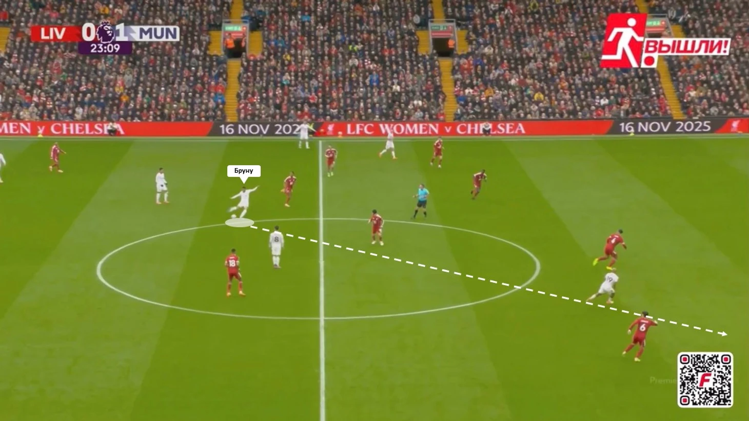 Однако подобная радужная картина переворачивалась на 180 градусов в других матчах, когда соперникам удавалось за счет опускания своих инсайдов и наполнения центра вынудить Бруну подниматься выше. Когда цепь давления не замыкалась – Каземиро не шел до упора или защитная линия оказывалась в полупозиции – выходили ситуации с отрезанием как минимум четверки (нападающий, инсайды и Бруну), как максимум шестерки (плюс вингбэки) игроков.