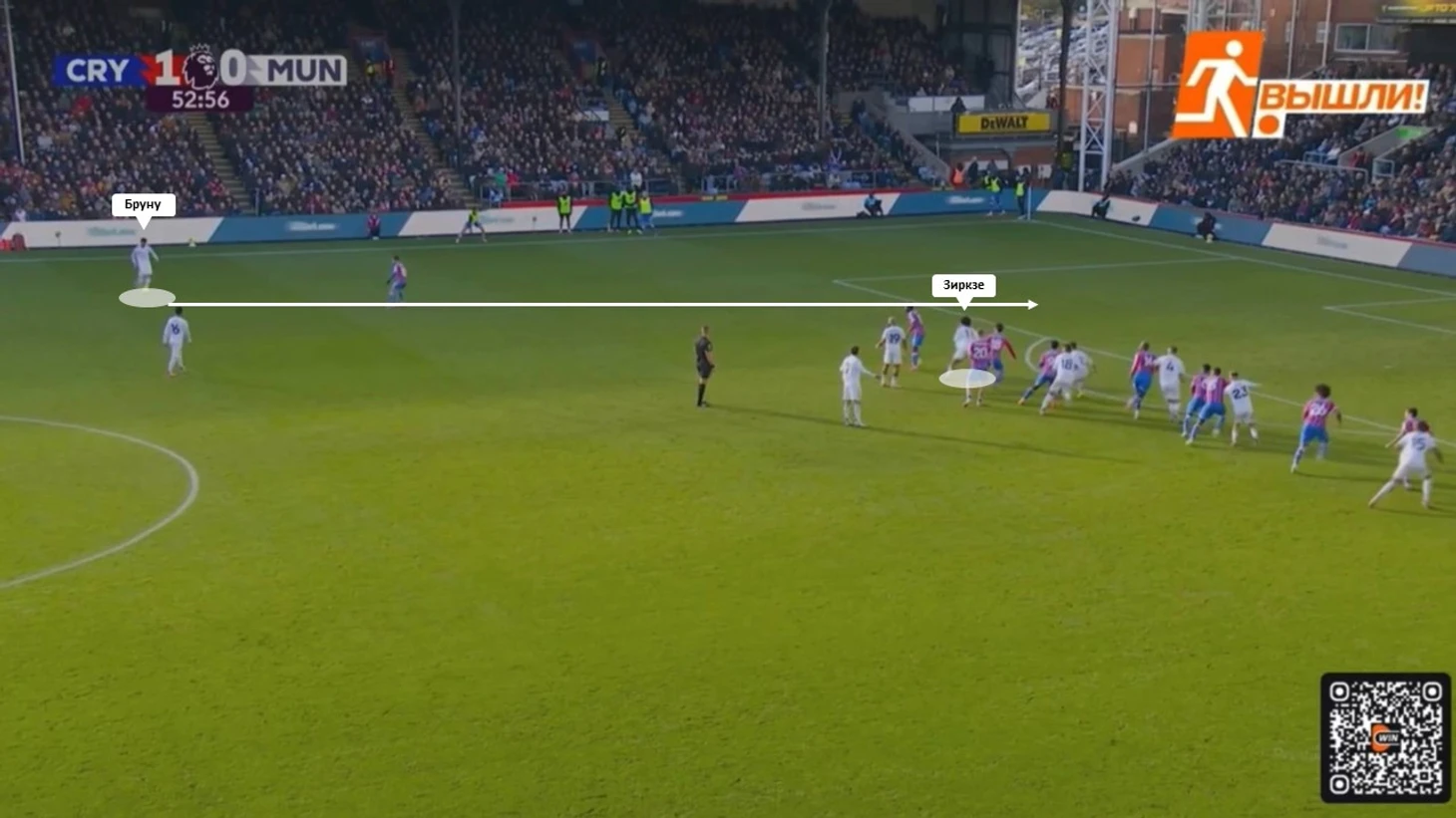 Стандарты – 9 моментов не считая аутов и 6 забитых мячей. Причем по своей специфике они довольно разные: и уходящие/приходящие угловые на дальнюю и в центральную зону, и розыгрыши штрафных (гол Зиркзе «Кристал Пэлас»), и прямые удары с них (гол Бруну в том же матче).