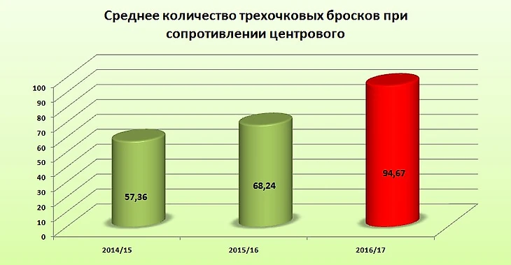 Как видим, всего за два сезона нагрузка центровых на периметре выросла практически вдвое. И вот тут уже пора отделять зерна от плевел и смотреть на то, что у кого удается, а что не особо.