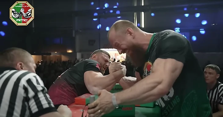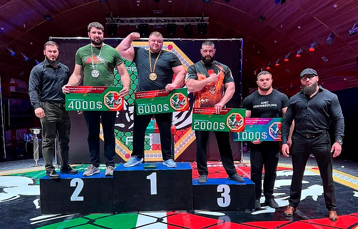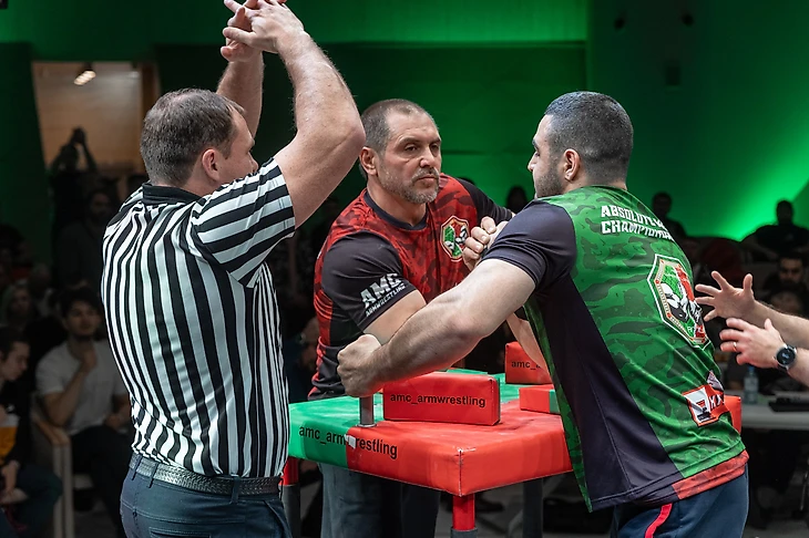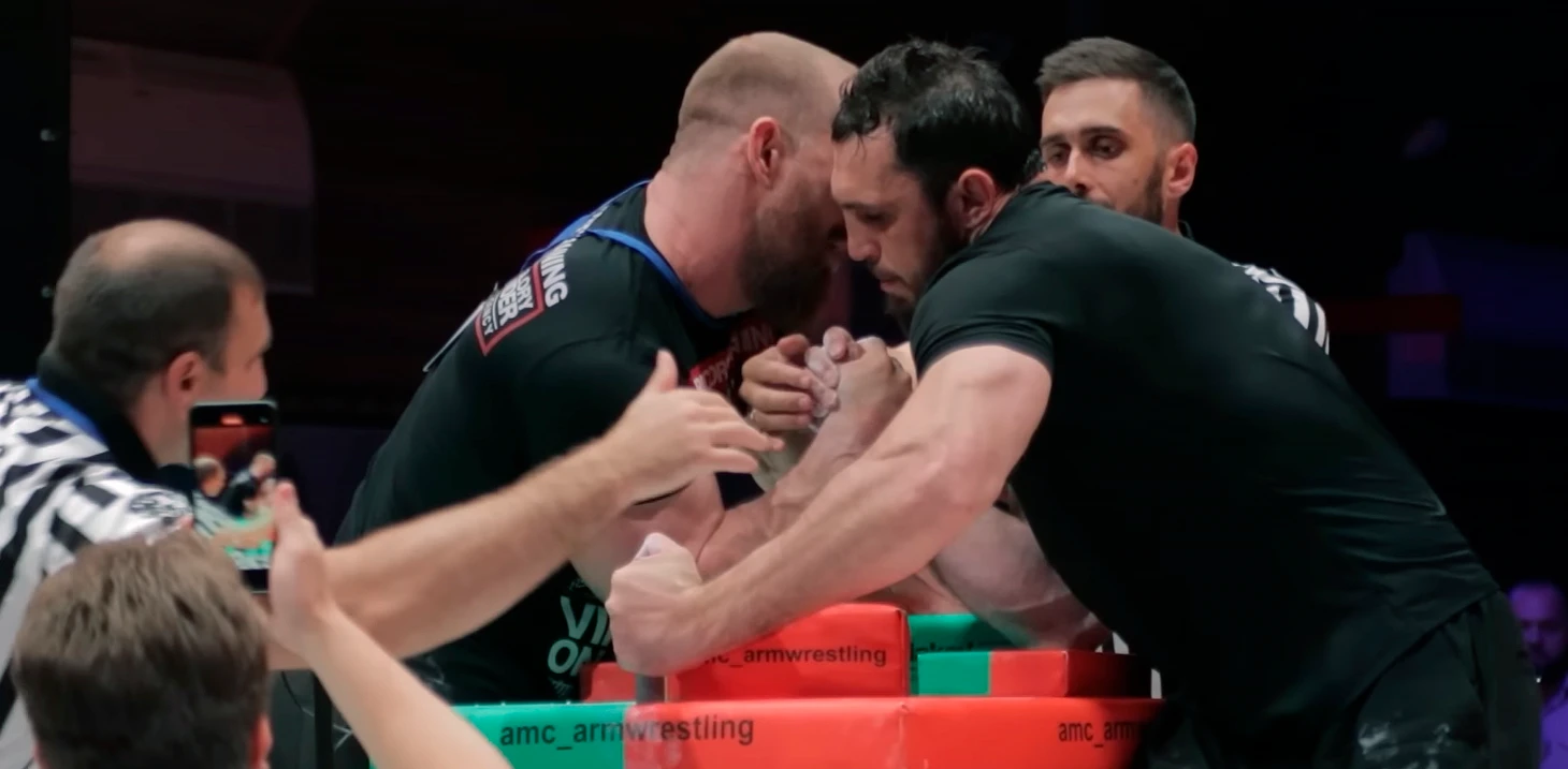Отдельного рассказа заслуживает и сам Сармат Дигуров, в Москве защитивший свой чемпионский титул АМС уже в третий раз! Да, оказавшись в нижней подгруппе осетинский рукоборец смог найти силы дойти до финала, где дважды одолел Байсангура Солтыханова. Но возможно у Сармата такая тактика, ведь на 5м турнире во Владикавказе он провернул такой же трюк! В предварительных поединках Сармат уступил Виктору Шевеленко, упал в нижнюю подгруппу, по которой смог добраться до финала, где вырвал победу у грузинского Терминатора Валико Ичкити.