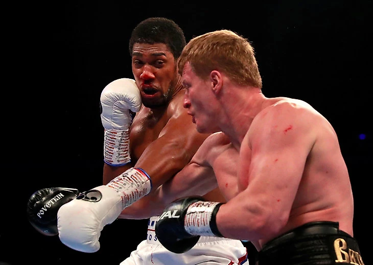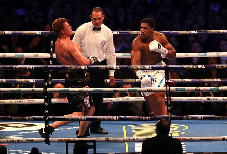 Поначалу у Поветкина даже немного получалось – в первых раундах он попал по Джошуа левым боковым и разбил нос. Но уже с третьего раунда Энтони начал брать поединок под свой контроль. Британец много и разнообразно двигался, старался не пускать россиянина на среднюю и ближнюю дистанцию, действовал на отходах, приучал к постоянному джебу и почти полному отсутствию серьезных атак справа. Чтобы заставить Александра вымахаться и обескуражить попаданиями с правой, сильнейшей руки. Бой прошел под диктовку Джошуа. В седьмом раунде Поветкин упал, встал и был добит.