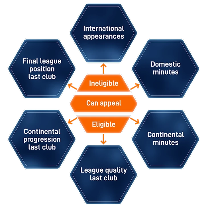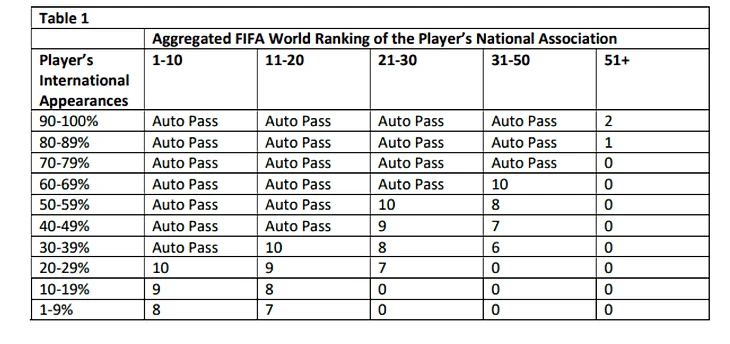 Как мы видим, «Auto Pass» основан на проценте матчей за сборные, сыгранных игроком в соответствующий период. Процентный порог тем выше, чем ниже мировой рейтинг ФИФА национальной ассоциации, где выступает игрок. Например, игрок получит «Auto Pass», если он заигран в 30% матчей своей национальной сборной, если эта команда занимает 1-10 место в мире. Однако, если команда находится в рейтинге 31-50, процентный порог составляет 70%. Если рейтинг национальной сборной 51+, автопроход недоступен в независимости от количества матчей. Если в столбце указаны баллы, то они идут в копилку для обращения в комиссию по исключениям.